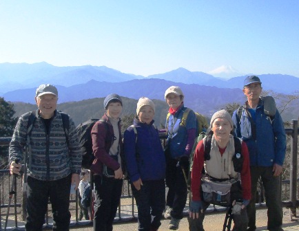 この辺りで見られる氷の華シモバシラはないかとうろうろ、向こうから来た人に聞いてみると「暖かいのでない」とのこと、やはりそうかと山頂に向かいました。山頂はにぎやかです。通り過ぎて富士山を見に行く。少しかすんで見える。春霞?黄砂? 休憩場所を求め一段下がり端っこの石垣を椅子替わりに座り早めのお昼にしました。